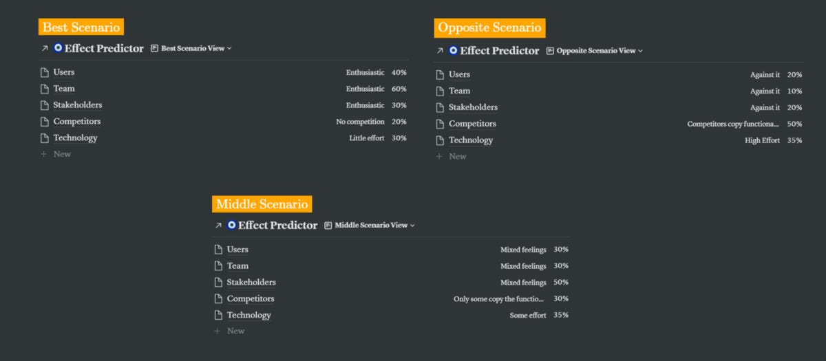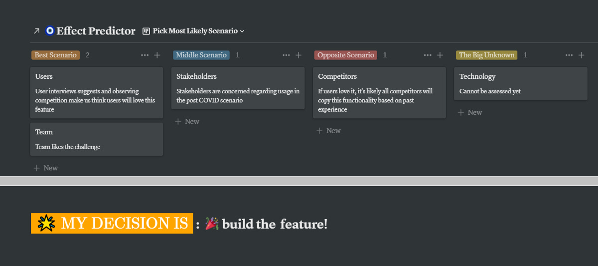 At this point, you want to see what will happen if you decide to build the feature. Note that you could also do the opposite, you could ask yourself what would happen if you do not build the feature.