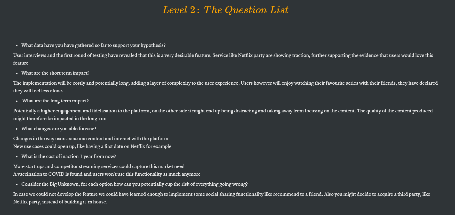 You are a Product Manager at Netflix. Since COVID-19 and social distancing, users are asking to add a functionality that will allow them to watch their favorite Netflix shows with their friends and loved ones remotely, inside the platform. You are thinking about a built-in video call system that will allow users to interact with each other on the platform while watching a show. While this sounds tempting, you are afraid that this functionality will distract users from enjoying the content. Furthermore, in the absence of social distancing, users might not want this functionality anymore, and you will have needlessly spent time, energy, and resources.