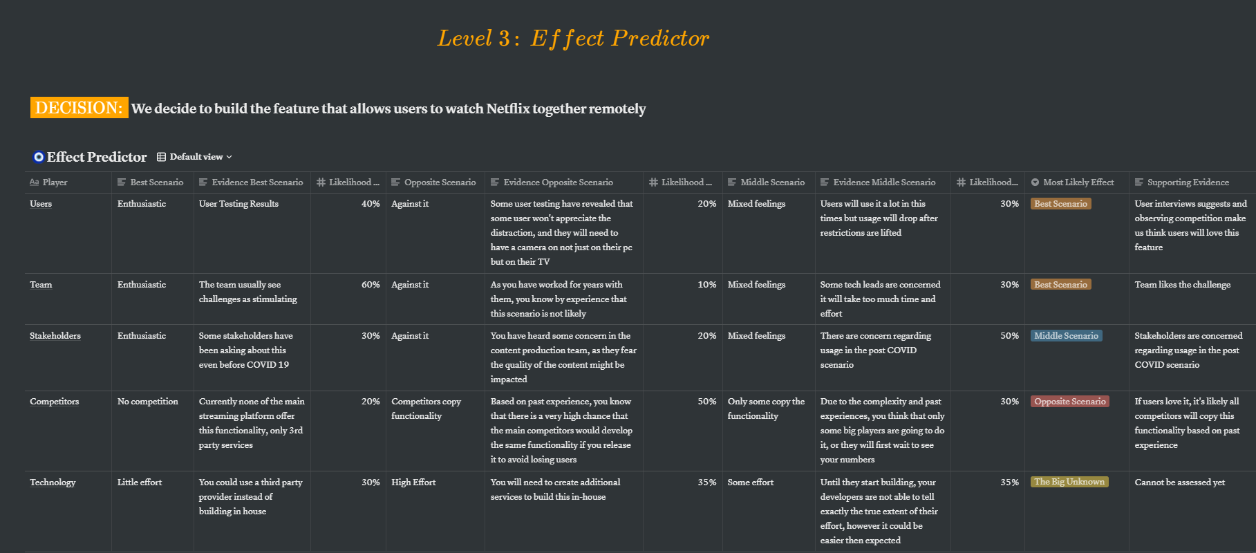 For every move, specify the supporting evidence and a percentage on the likelihood that it will come to pass. Through this process, you will be able to pick the “most likely effect” for each Player and to motivate your choice.