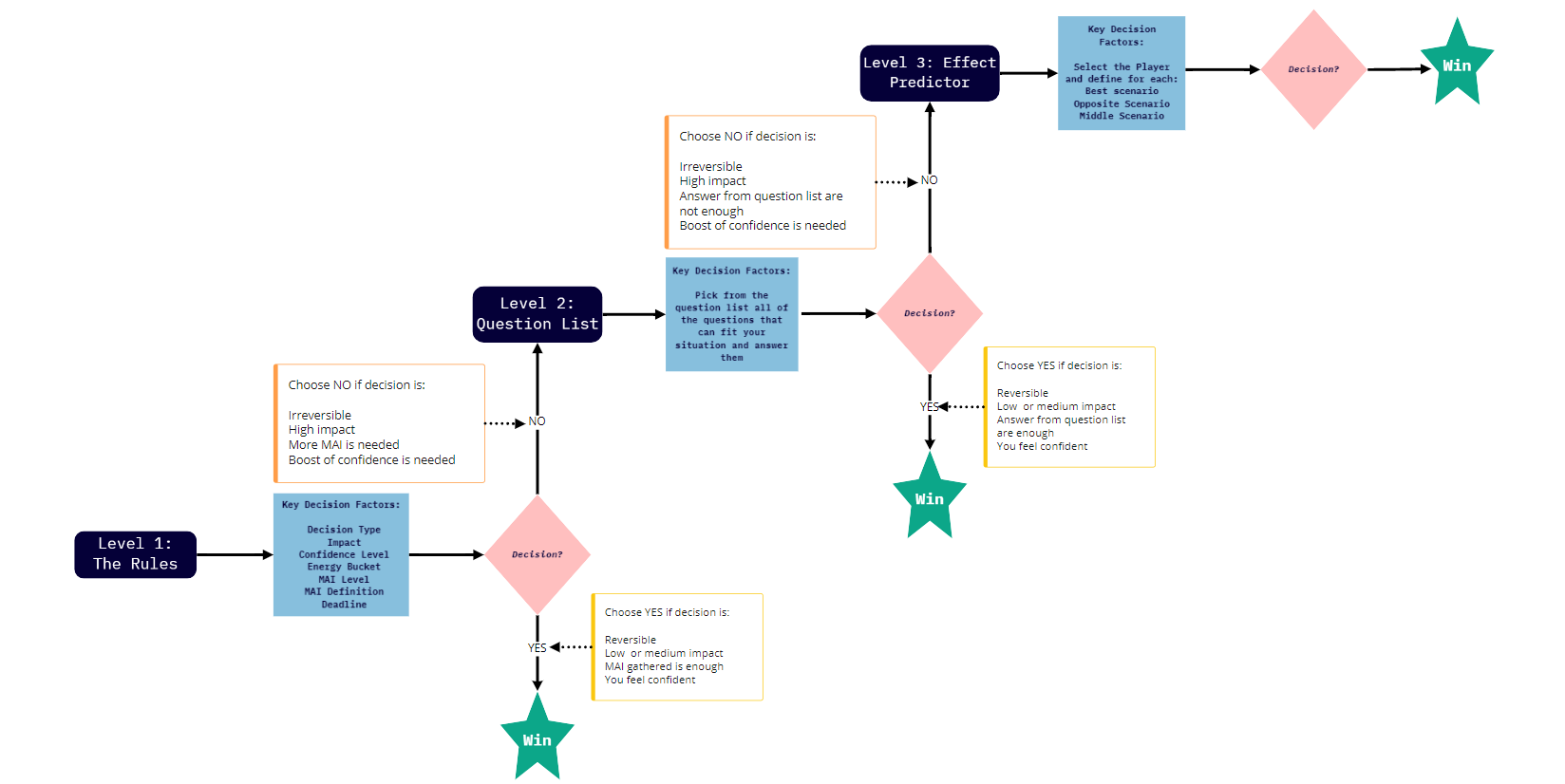 The Blind Game Method: a 3 level decision-making process. Each level is designed to help you make a decision as fast as possible, or to guide you to the next level if you need an additional layer of clarity